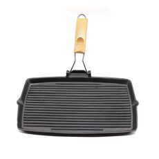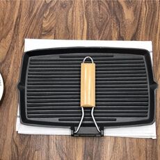 SOGA 20.5cm Rectangular Cast Iron Griddle Grill Frying Pan with Folding Wooden Handle