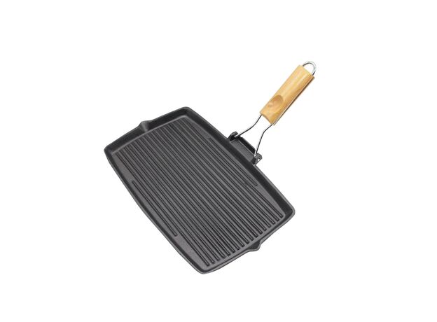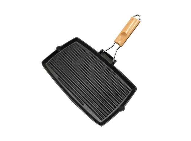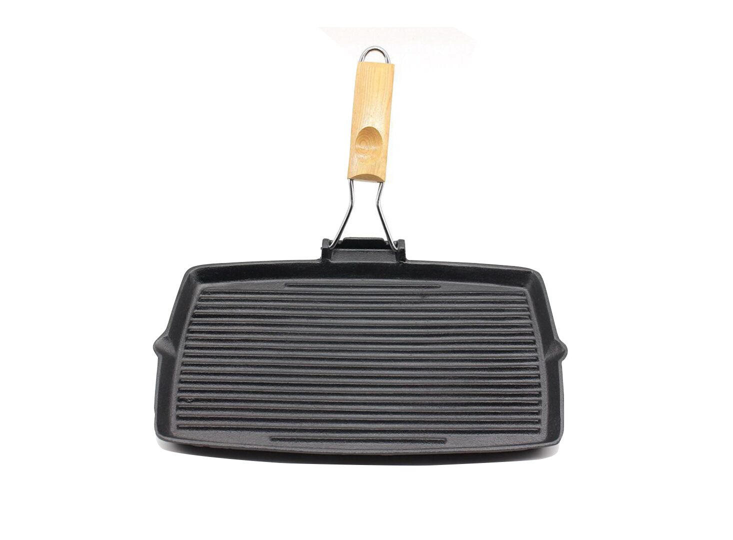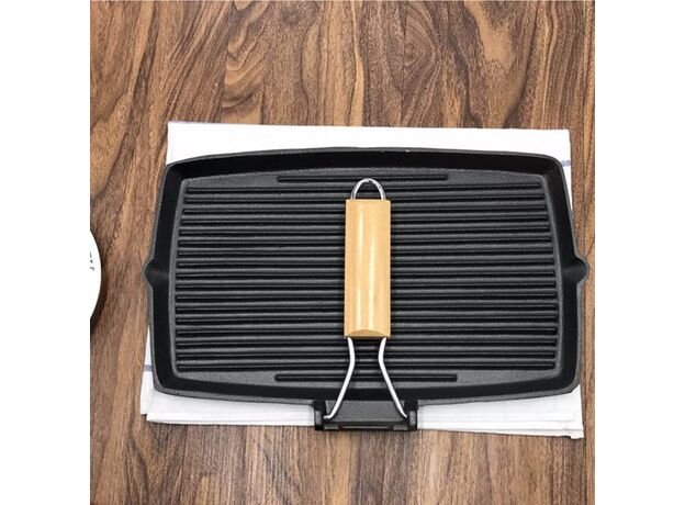 SOGA 20.5cm Rectangular Cast Iron Griddle Grill Frying Pan with Folding Wooden Handle
