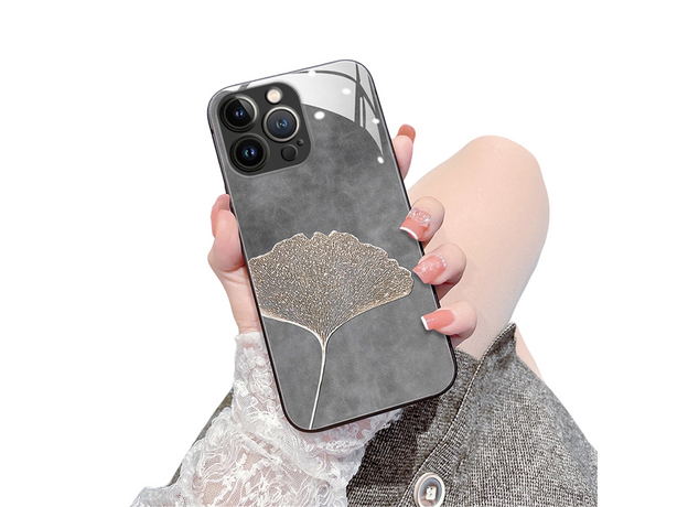 anyco iPhone Case Gray Vintage Leaves Tempered Glass Silicon Back Cover
