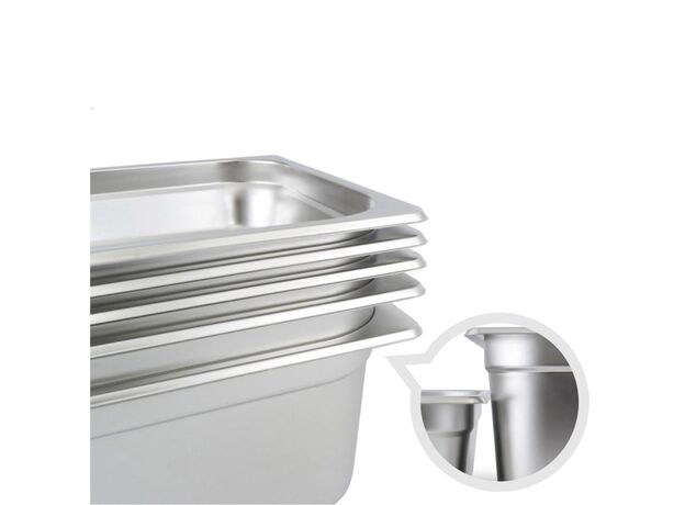 - Anti-jam stacking lugs ensure that the Gastronorm pan won't stick to other pans when you take it out of storage. This feature allows you to save space by stacking pans without worrying about a hassle the next time you want to use them.